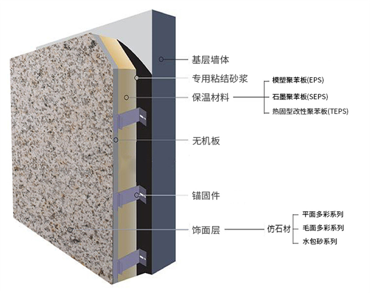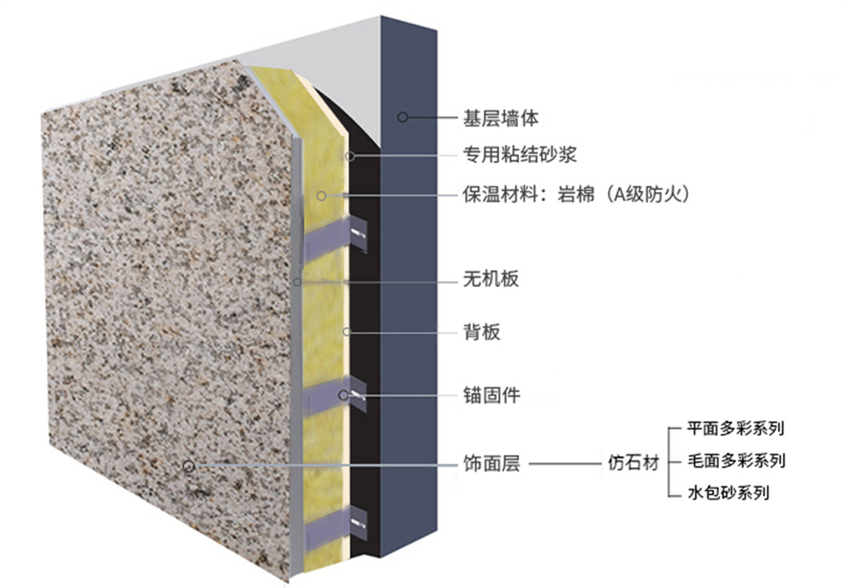 無機(jī)板類多彩仿石保溫裝飾一體板選用高密度、高強(qiáng)度A1級無機(jī)板為基材,通過精砂、滲透封閉、界面處理、飾面噴涂(輥涂)、固化、養(yǎng)護(hù)、復(fù)合等多道現(xiàn)代化生產(chǎn)工序加工成型。